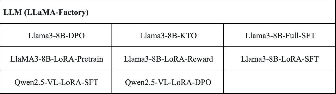 ● 新增了8个大模型训练微调示例,使用了LLaMA-Factory工具箱。