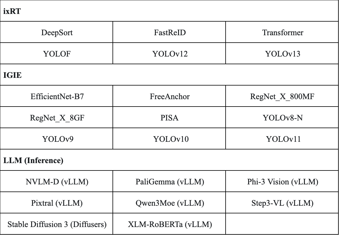 ● 新增了15个推理小模型示例,其中支持IGIE推理引擎的9个,支持ixRT推理引擎的6个。